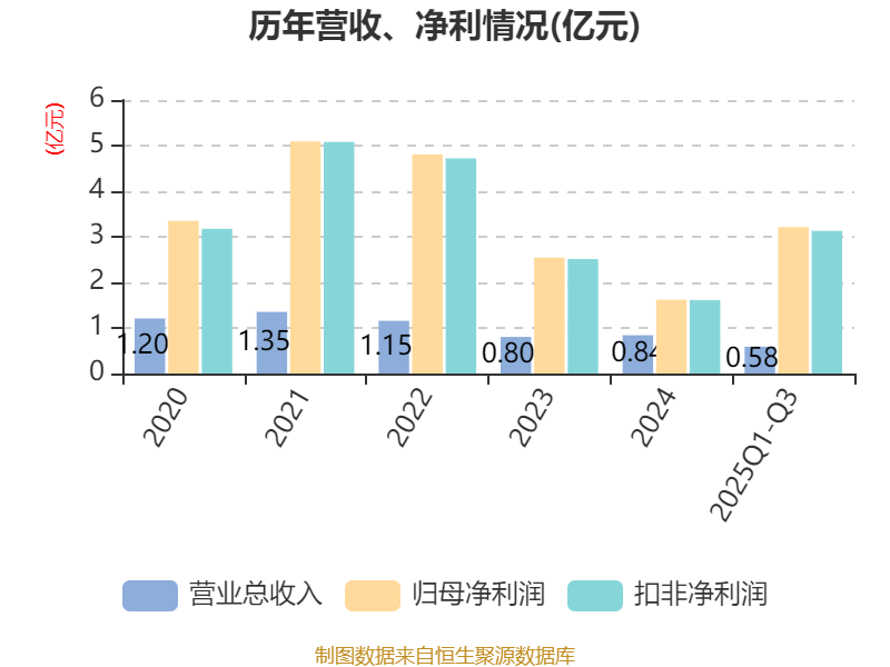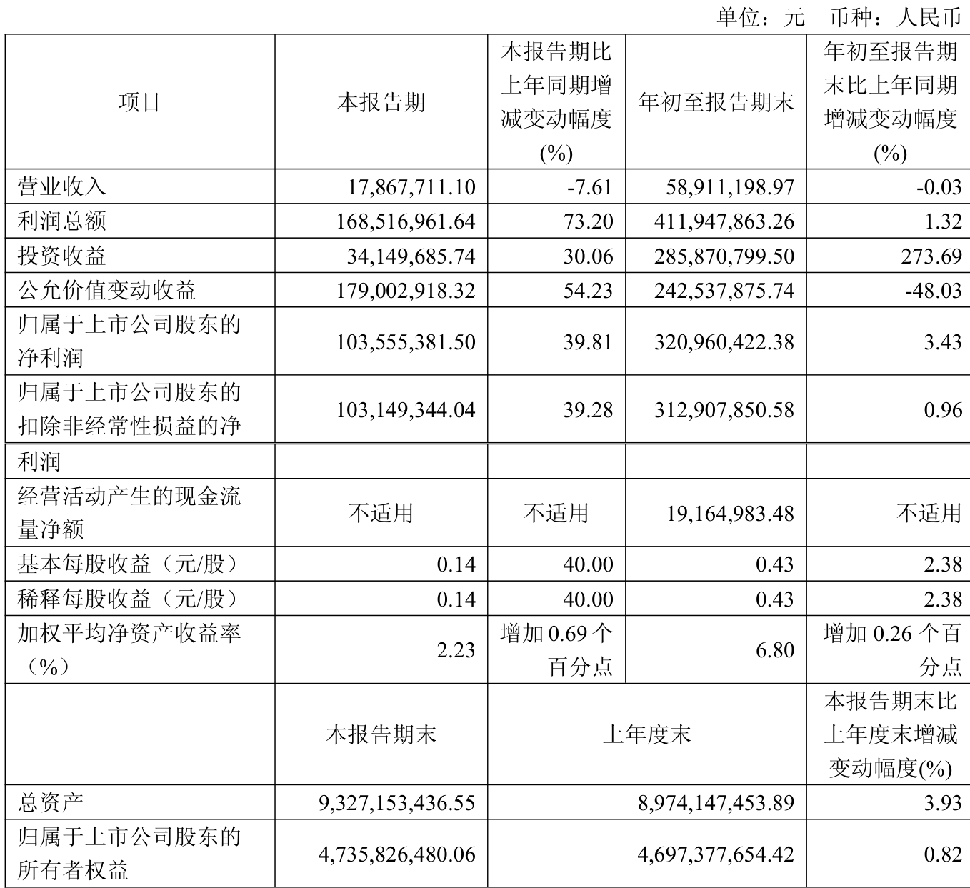 中证智能财讯鲁信创投(600783)10月31日披露2025年第三季度报告。前三季度公司实现营业总收入5891.12万元,同比下降0.03%;归母净利润3.21亿元,同比增长3.43%;扣非净利润3.13亿元,同比增长0.96%;经营活动产生的现金流量净额为1916.5万元,上年同期为-1078.42万元;报告期内,鲁信创投基本每股收益为0.43元,加权平均净资产收益率为6.80%。
