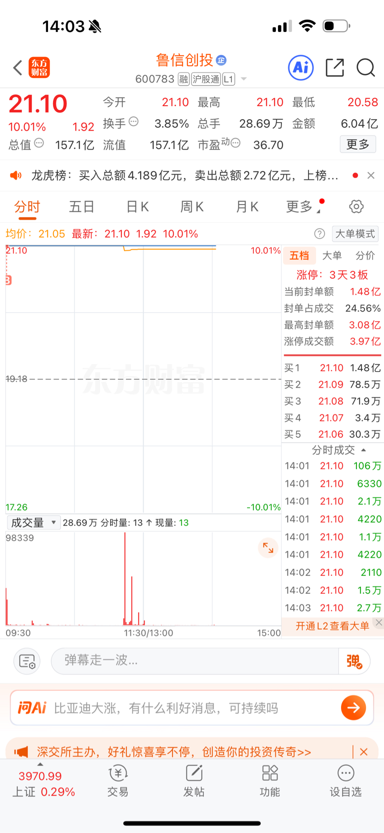 $鲁信创投(SH600783)$ 兄弟们,星期一我能分一点肉吗