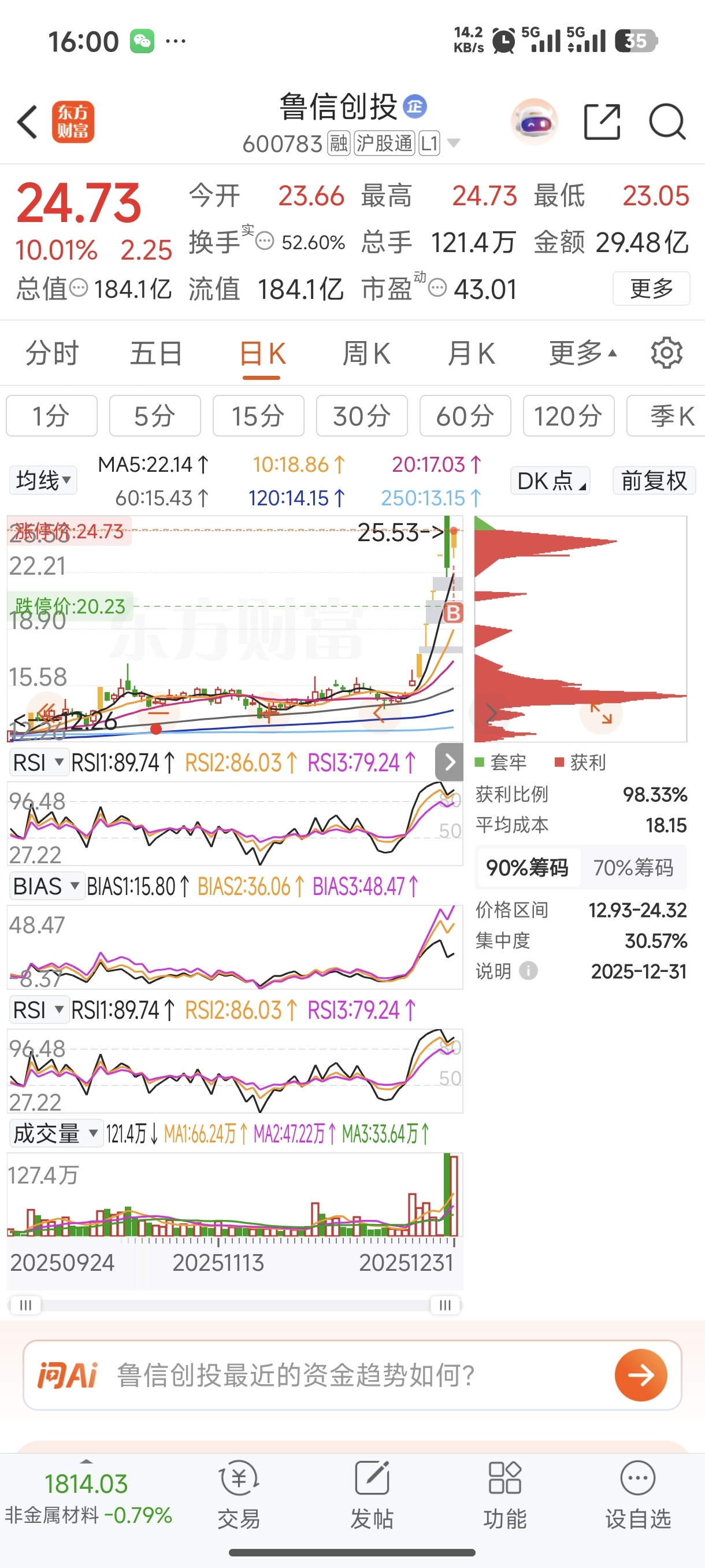 $鲁信创投(SH600783)$ 今天盘面怎么样不说反正很凶险,如果我是昨天买的,肯定拿不住,从结果上看,量能筹码峰来看,今天筹码峰这么大一坨,绝对有新主力进来了,不管怎样,地板应该不可能,主力肯定会自救,周一红开就格局绿开马上跑。