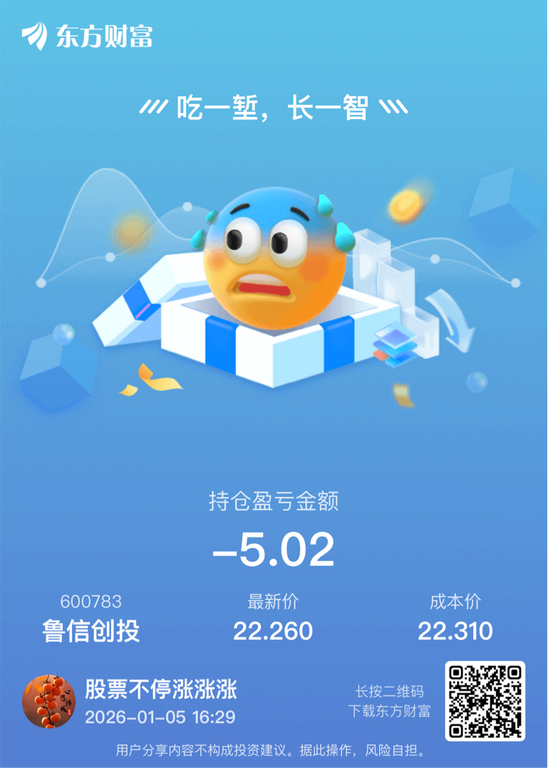 $鲁信创投(SH600783)$ 金风不敢买,机电看了半天也不买,结果地天板,我买了你,纹丝不动,明天大概率还有一个地板,兄弟们求安慰