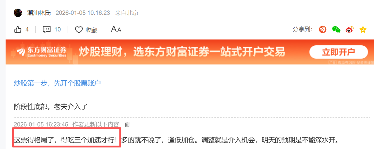 温馨提示: 1.根据《证券法》规定,禁止编造、传播虚假信息或者误导性信息,扰乱证券市场;2.用户在本社区发表的所有资料、言论等仅代表个人观点,与本网站立场无关,不对您构成任何投资建议。用户应基于自己的独立判断,自行决定证券投资并承担相应风险。《东方财富社区管理规定》