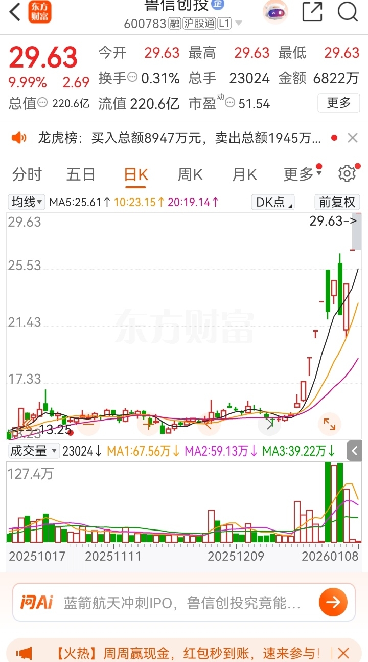 10天8板大牛股鲁信创投,对蓝箭航天持股不足1%。持仓少没关系,鲁信现在盘子小,