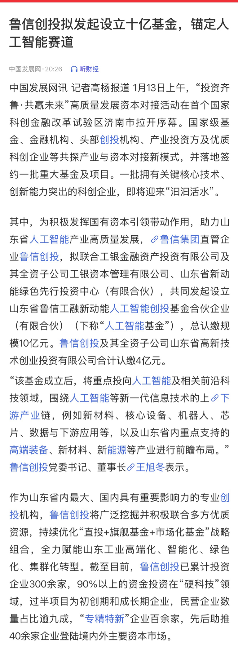 鲁信创投设立十亿基金 锚定人工智能