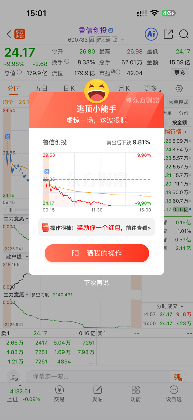 $鲁信创投(SH600783)$ 昨天那么大的利好,居然炸板,板块情绪还那么好,走成那个德性,所以今天开盘直接卖! 没想到卖完之后下跌那么多,逃过一劫