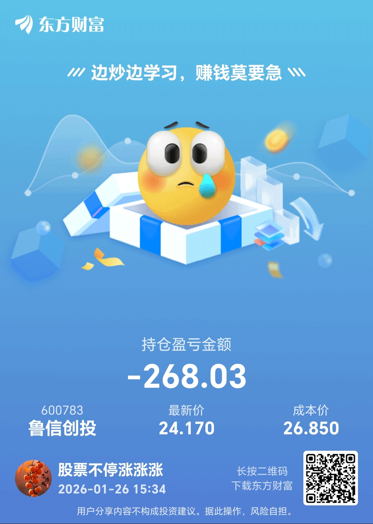 $鲁信创投(SH600783)$ 今天早盘亏20,结果地板一个,明天大概率也是地板,怎么办,兄弟们求安慰