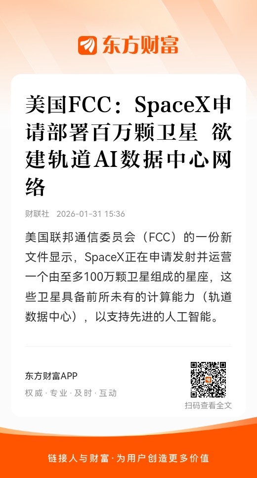 美国FCC:SpaceX申请部署百万颗卫星 欲建轨道AI数据中心网络