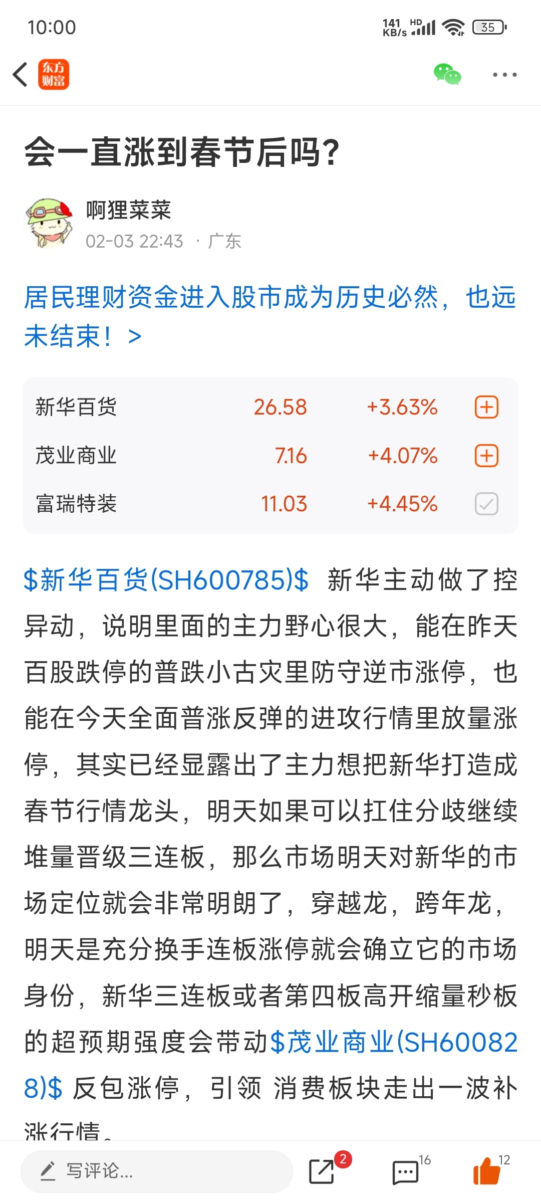 $新华百货(SH600785)$ 新华百货要主动走强晋级三板,不能让$茂业商业(SH600828)$ 反推你走呀!你是龙头,茂业还指望你涨停晋级带它反包涨停呀!你作为龙头的主动性在哪里?没有主动性怎么当领头羊呀!十点半之前要封板呀!$富瑞特装(SZ300228)$ 今天表现不错,加油,拉一个20厘米涨停板出来启动主升浪!