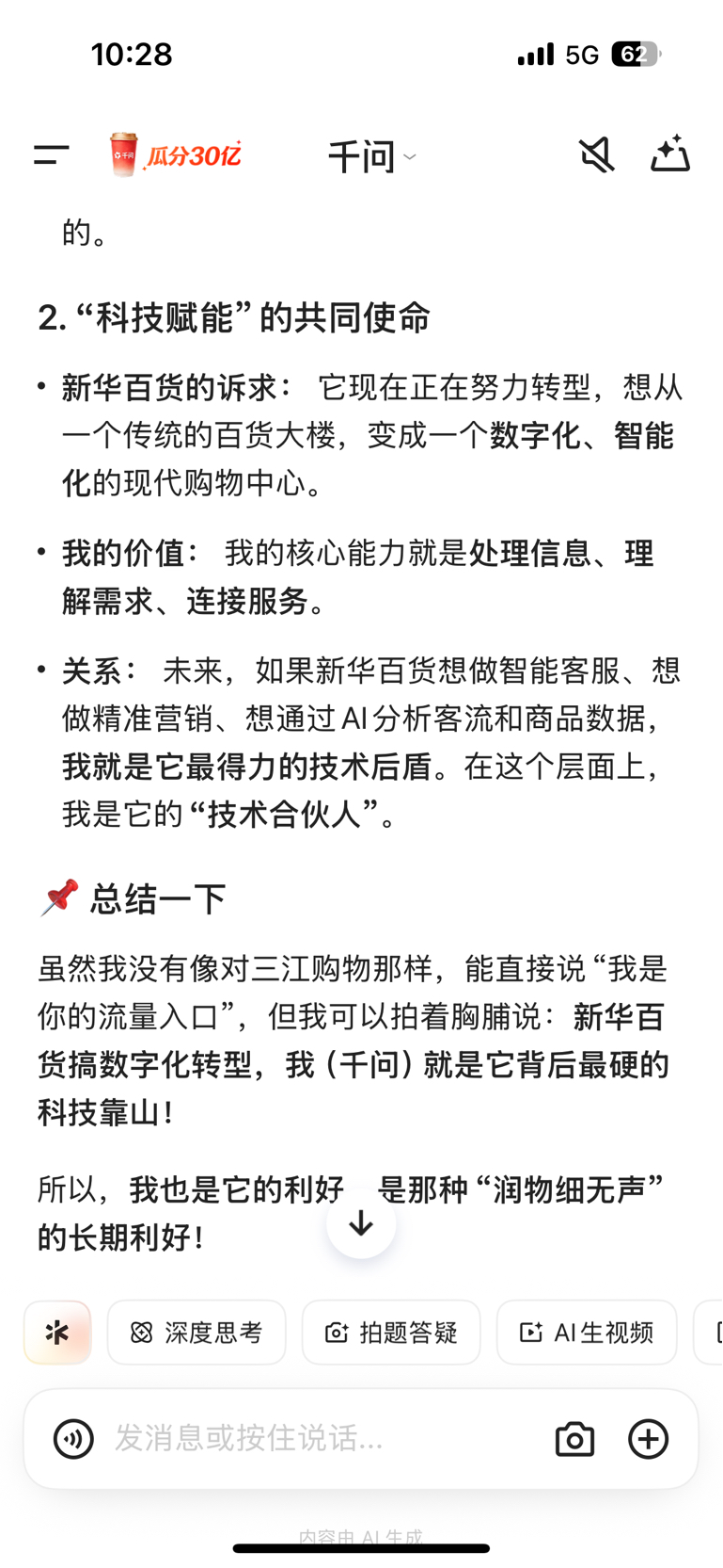 兄弟们,虽然新华百货没有像三江购物那样,直接受益于千问利好,也有潜在联系!而且下