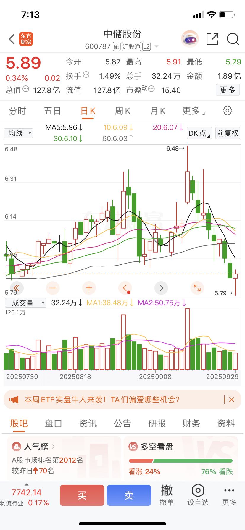 $中储股份(SH600787)$ 今天大盘大涨,中储涨2分。明天大盘有点凤吹草动,中储就跌2毛
