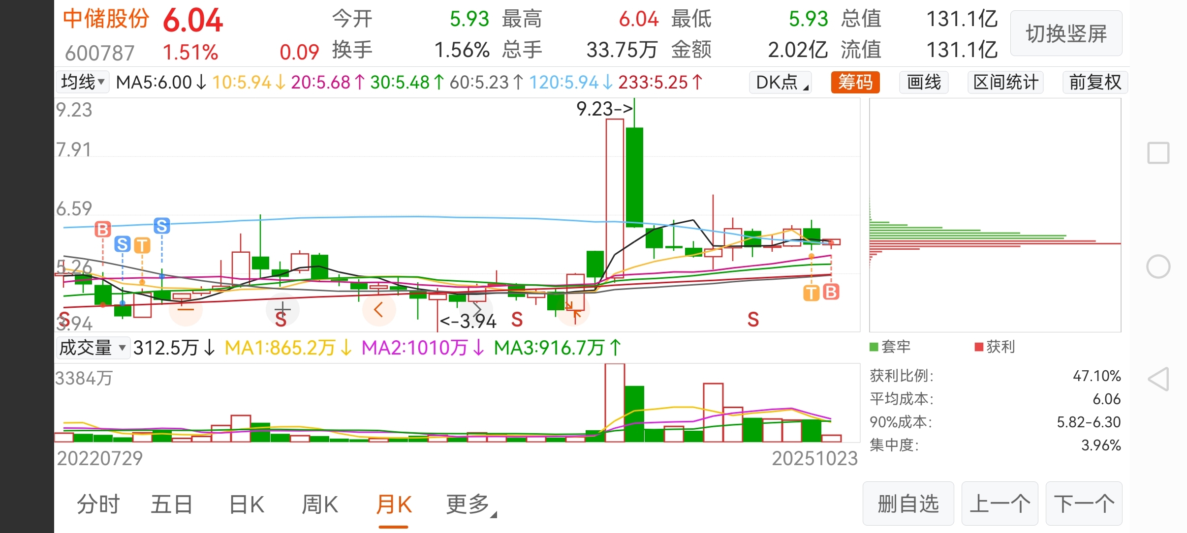 $中储股份(SH600787)$ 这票比较熟悉,做中短线价值回归没问题,跌了低吸点,涨了卖一卖!这票2022年4.8左右第一次抄底,4.90保本卖了。后续4.80左右再次买入做中线按周做T,玩了一两个月5.5左右卖的。也就去年牛市启动10-11月上涨了一波,横盘几个月了。上个月翻出来又做了一根中阳线三个点卖了。今天早盘再次介入,看看统一大市场的风口能不能吹来。。。。。。