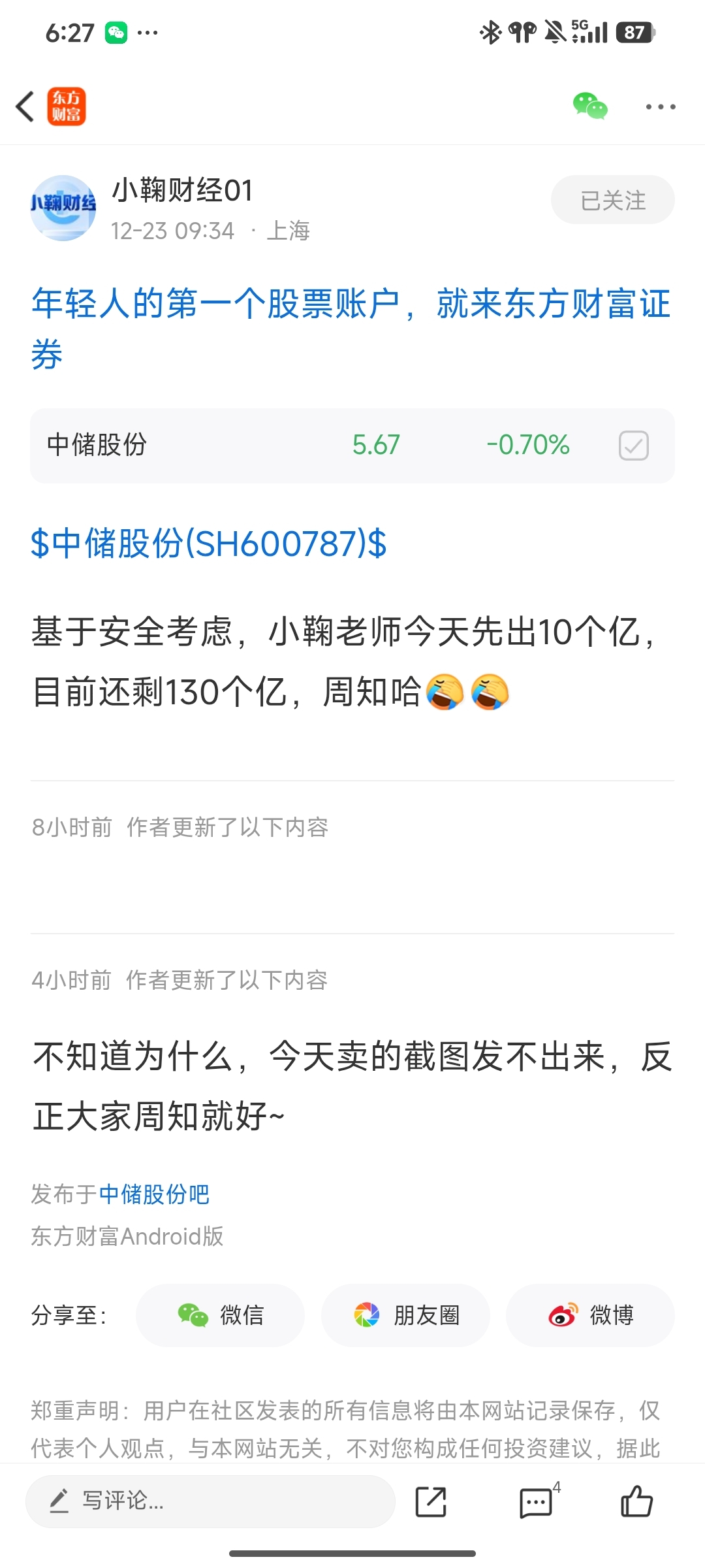 温馨提示: 1.根据《证券法》规定,禁止编造、传播虚假信息或者误导性信息,扰乱证券市场;2.用户在本社区发表的所有资料、言论等仅代表个人观点,与本网站立场无关,不对您构成任何投资建议。用户应基于自己的独立判断,自行决定证券投资并承担相应风险。《东方财富社区管理规定》
