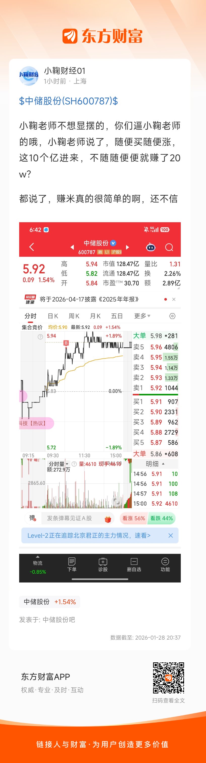 温馨提示: 1.根据《证券法》规定,禁止编造、传播虚假信息或者误导性信息,扰乱证券市场;2.用户在本社区发表的所有资料、言论等仅代表个人观点,与本网站立场无关,不对您构成任何投资建议。用户应基于自己的独立判断,自行决定证券投资并承担相应风险。《东方财富社区管理规定》