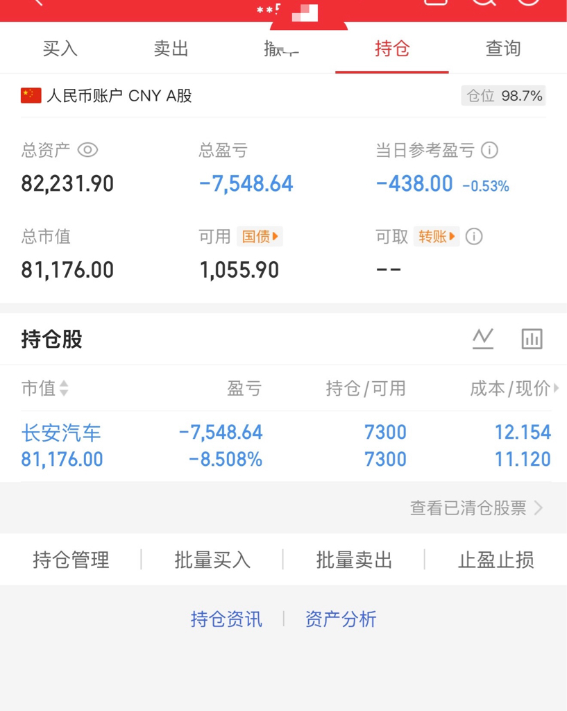 $中储股份(SH600787)$ 2024年12月进来的,说牛市来了,价值投资,有两个孩子希望能改善生活,买了中储和长安汽车,长安买了4万块,一直补仓一直跌,工资7000块全补了,靠老婆工资维持生活,本来就不富裕,结果雪上加霜。