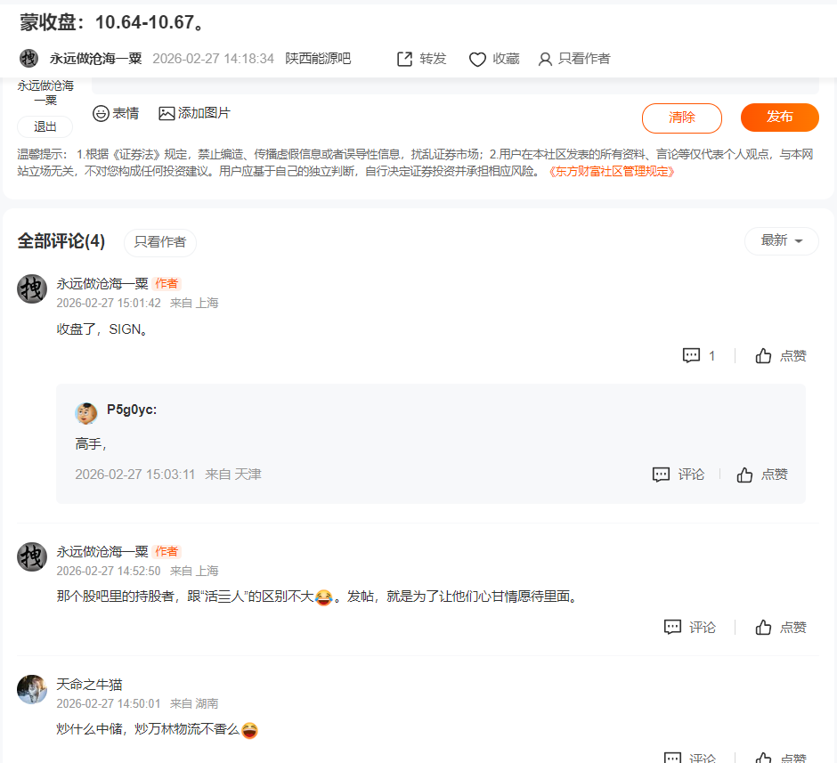 温馨提示: 1.根据《证券法》规定,禁止编造、传播虚假信息或者误导性信息,扰乱证券市场;2.用户在本社区发表的所有资料、言论等仅代表个人观点,与本网站立场无关,不对您构成任何投资建议。用户应基于自己的独立判断,自行决定证券投资并承担相应风险。《东方财富社区管理规定》