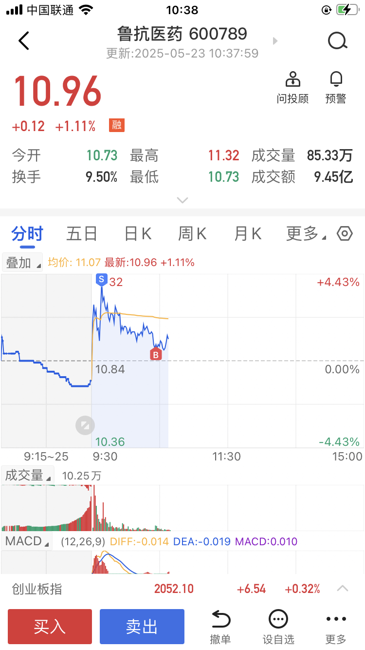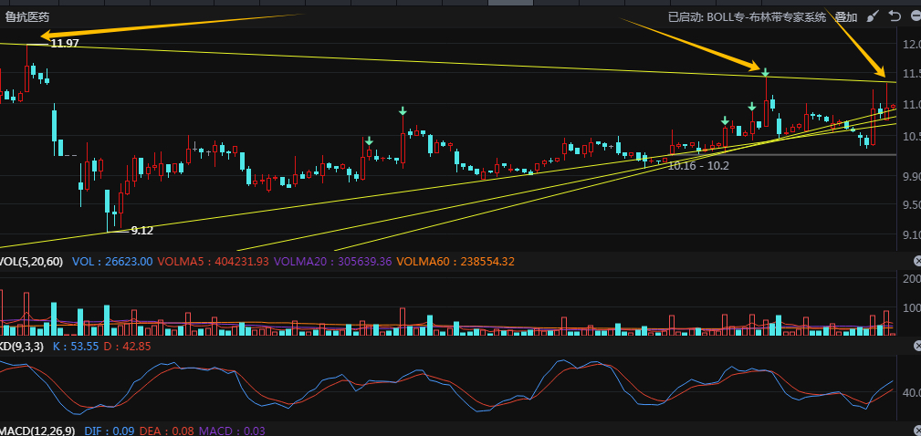 $鲁抗医药(SH600789)$ 持9千股,早上11.25减仓4千股,不是临时决定,是昨晚复盘提前规划好的,开盘挂单,随缘成交的,因为11.3左右落在60分钟图11.97高点下来的下压趋势线上(图3是全图,图2放大图)短线是减仓点,10.91接回,是盘中决定,个人感觉是冲动了,要不要T出看下午走势吧