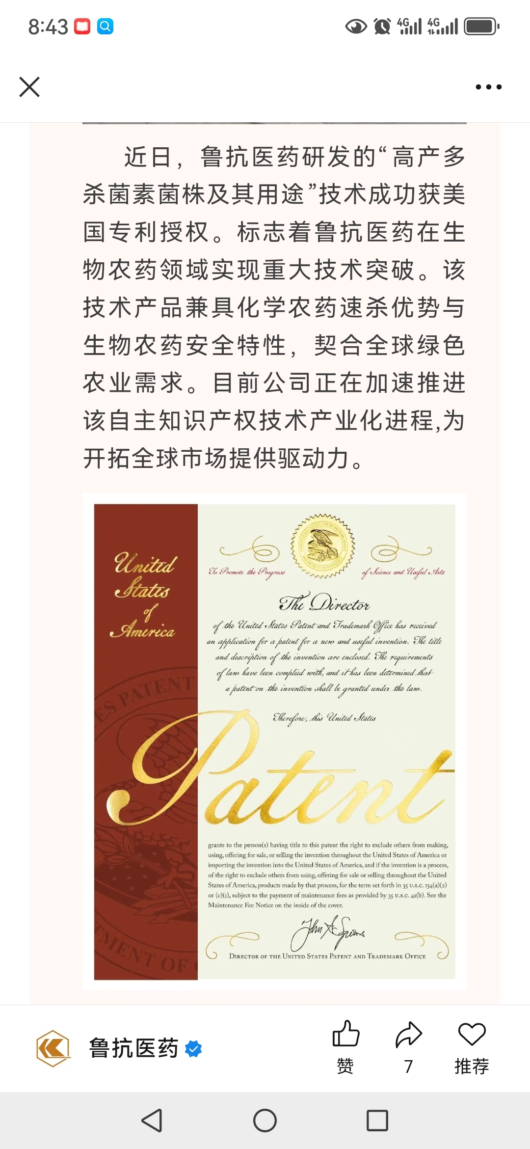鲁抗美国专利的北美独家代理权会卖给美国公司吗?