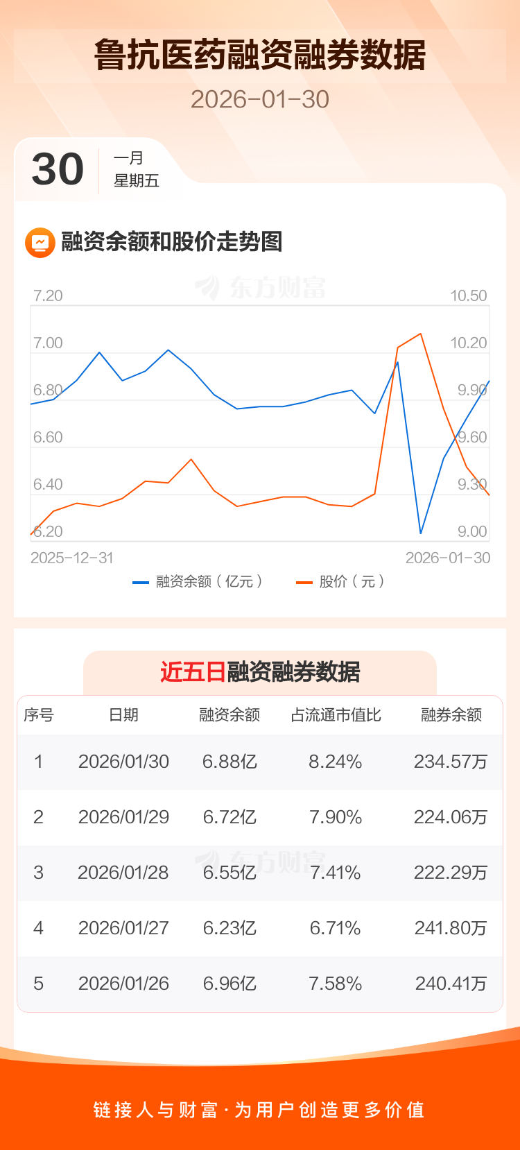 交易所最新数据显示,鲁抗医药于2026年1月30日获融资买入6566.25万元,融资偿还4943.76万元,当日融资净买入1622.49万元。目前,该股融资余额6.88亿,占流通市值比例为8.24%。
