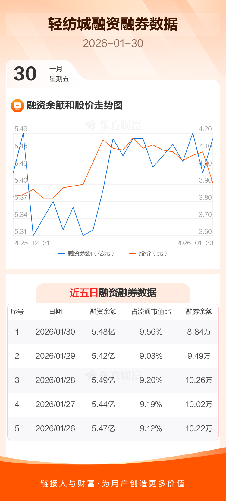 交易所最新数据显示,轻纺城于2026年1月30日获融资买入1870.17万元,融资偿还1216.86万元,当日融资净买入653.31万元。目前,该股融资余额5.48亿,占流通市值比例为9.56%。