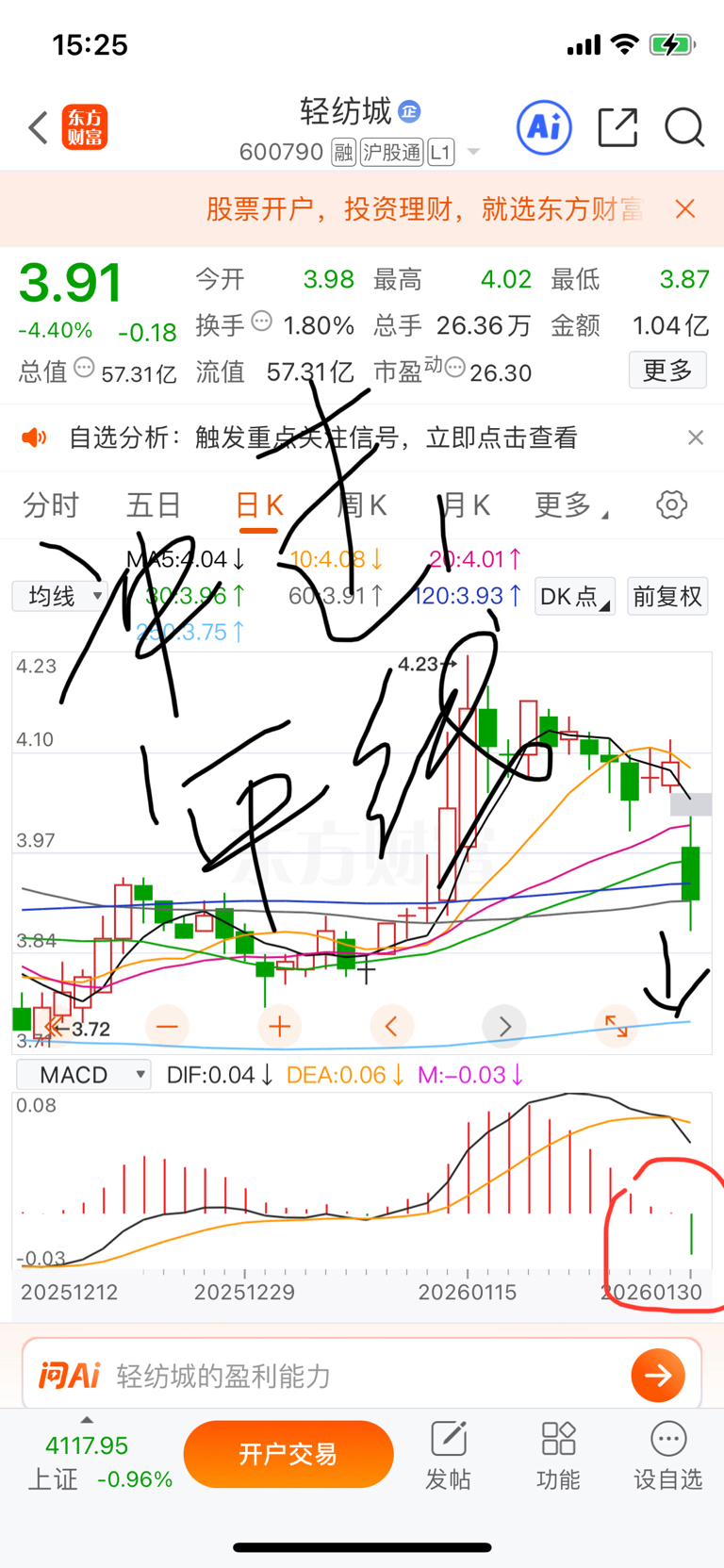 轻纺城总体走势属于强势之中(甩开年线较远)!如果调整至年线附近3.60左右!可以进场操底!