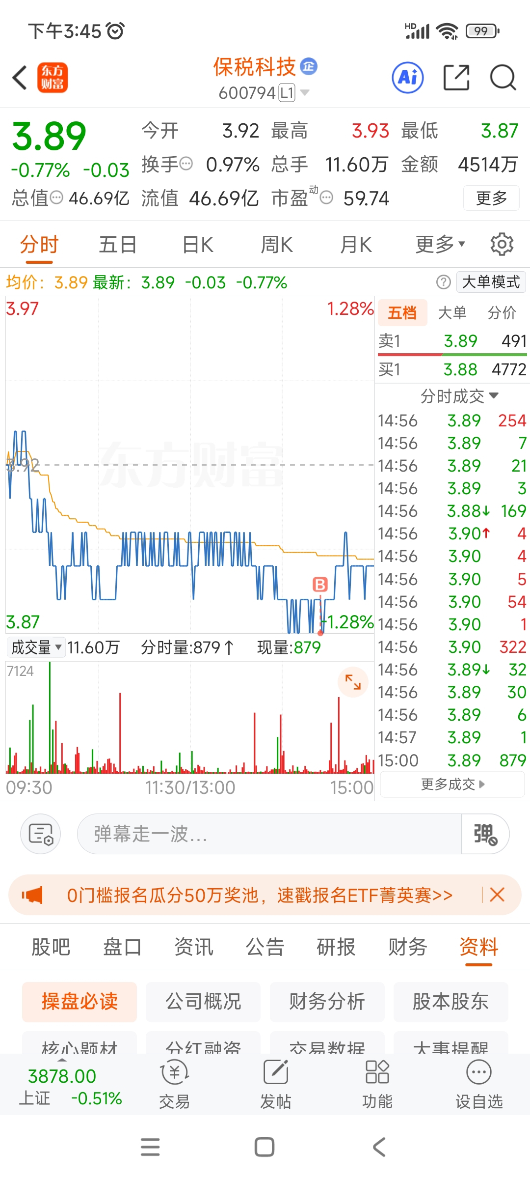 $保税科技(SH600794)$ 星尘3.87建仓了,勇敢的赚了Gou庄2分钱,叫兄弟们知道还是有获利盘的