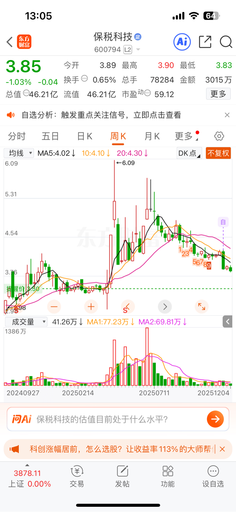 $保税科技(SH600794)$ 我也在等、准备抄底