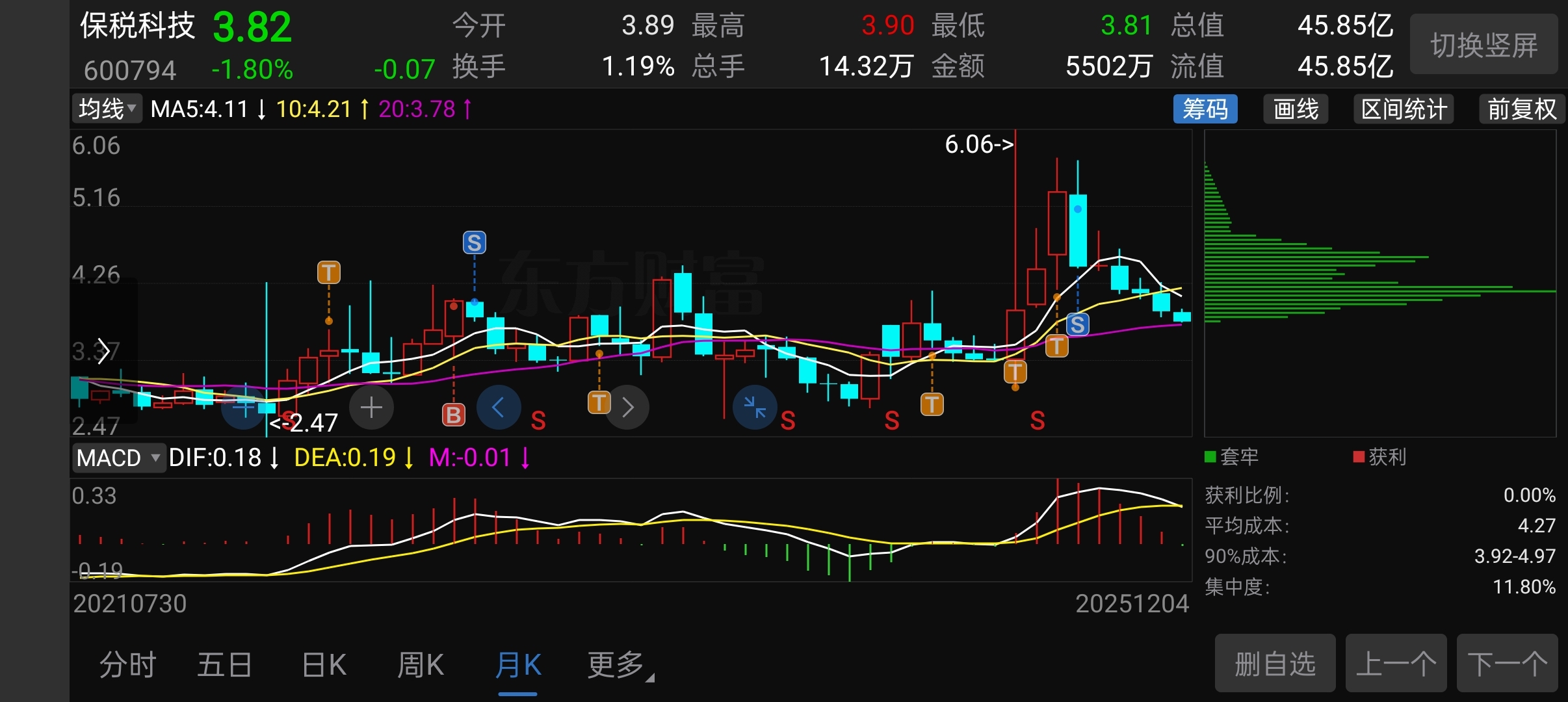 $保税科技(SH600794)$ 这个股我盈利80个点.上半年散户大量涌进我就知道要完了.直接清仓半年没看跟我一预想差不多走势.