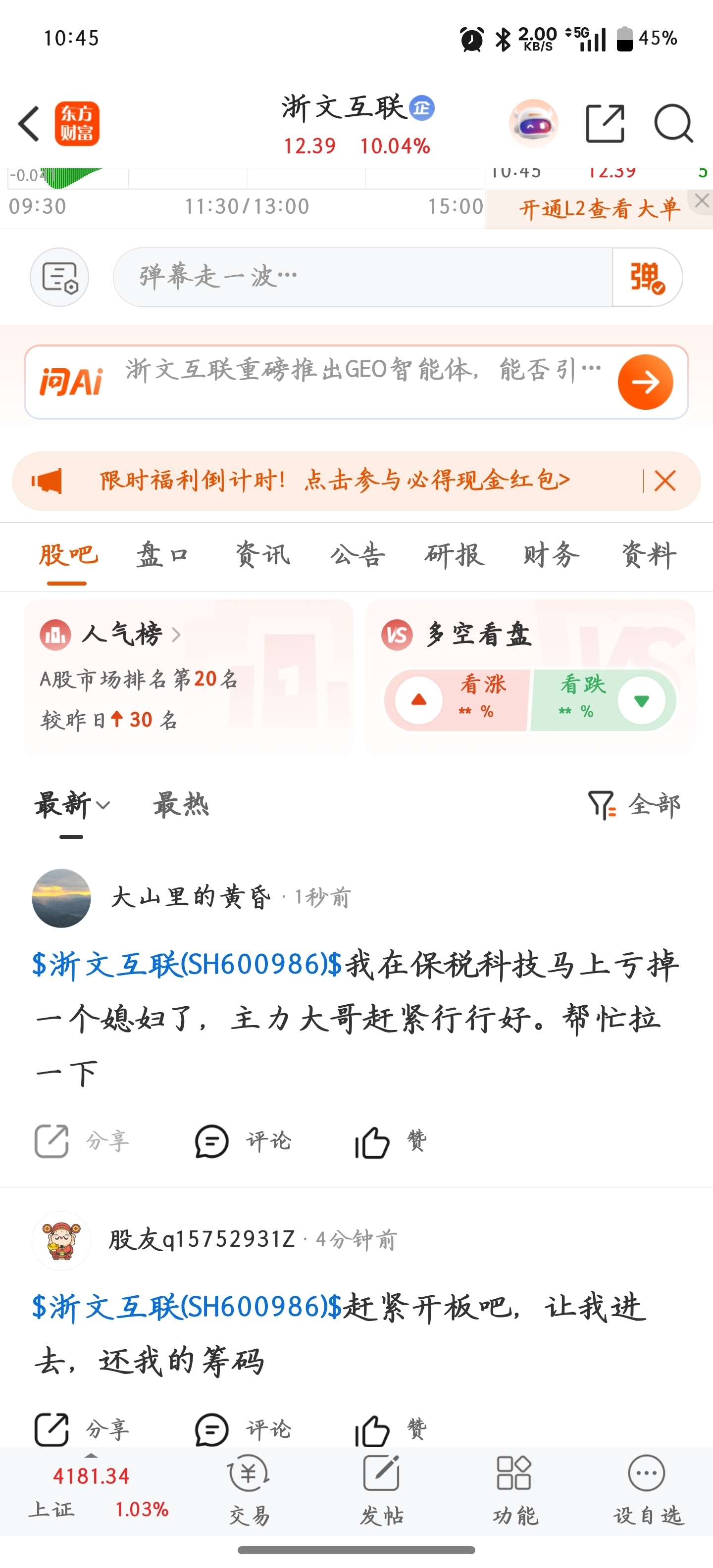 温馨提示: 1.根据《证券法》规定,禁止编造、传播虚假信息或者误导性信息,扰乱证券市场;2.用户在本社区发表的所有资料、言论等仅代表个人观点,与本网站立场无关,不对您构成任何投资建议。用户应基于自己的独立判断,自行决定证券投资并承担相应风险。《东方财富社区管理规定》