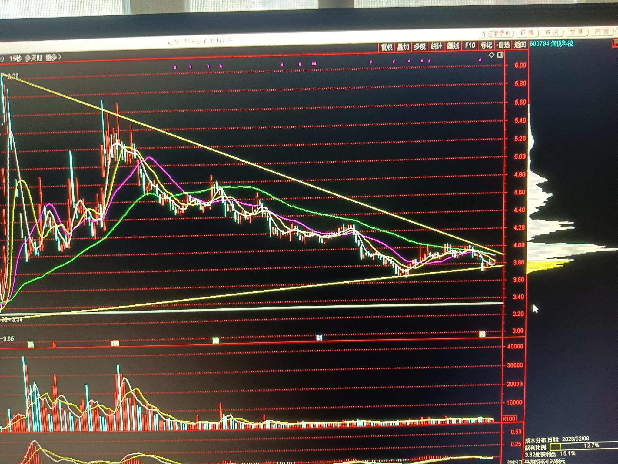 $保税科技(SH600794)$ 大型三角形收敛,接近尾声(希望再磨一个月,等我做完其他再搞你),继续整理,底部增厚。继续观察。