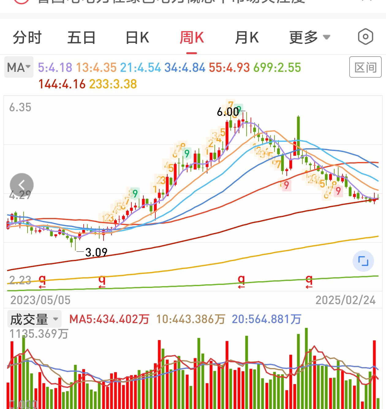 $国电电力(SH600795)$ 还跌不跌,我说的不算,人心齐泰山移,周K线再奉上,做T的别太用力,小心飞掉了