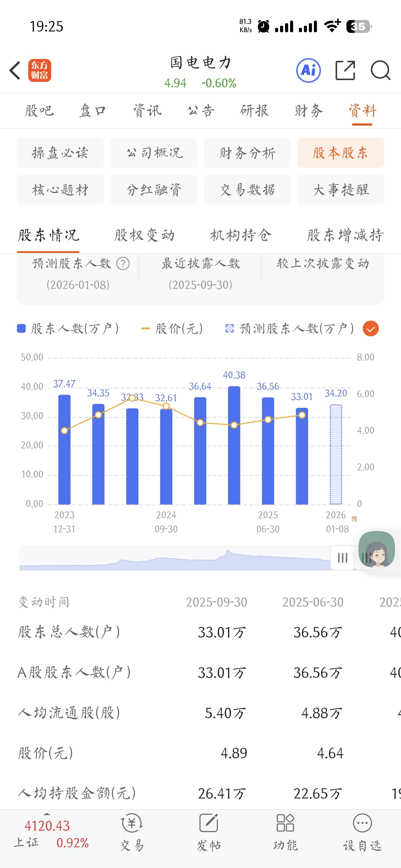 $国电电力(SH600795)$ 记得某v调仓,看股东预测人数是下降的,30多万。没想到调整之后股东预测人数反而增长了,34万多了,