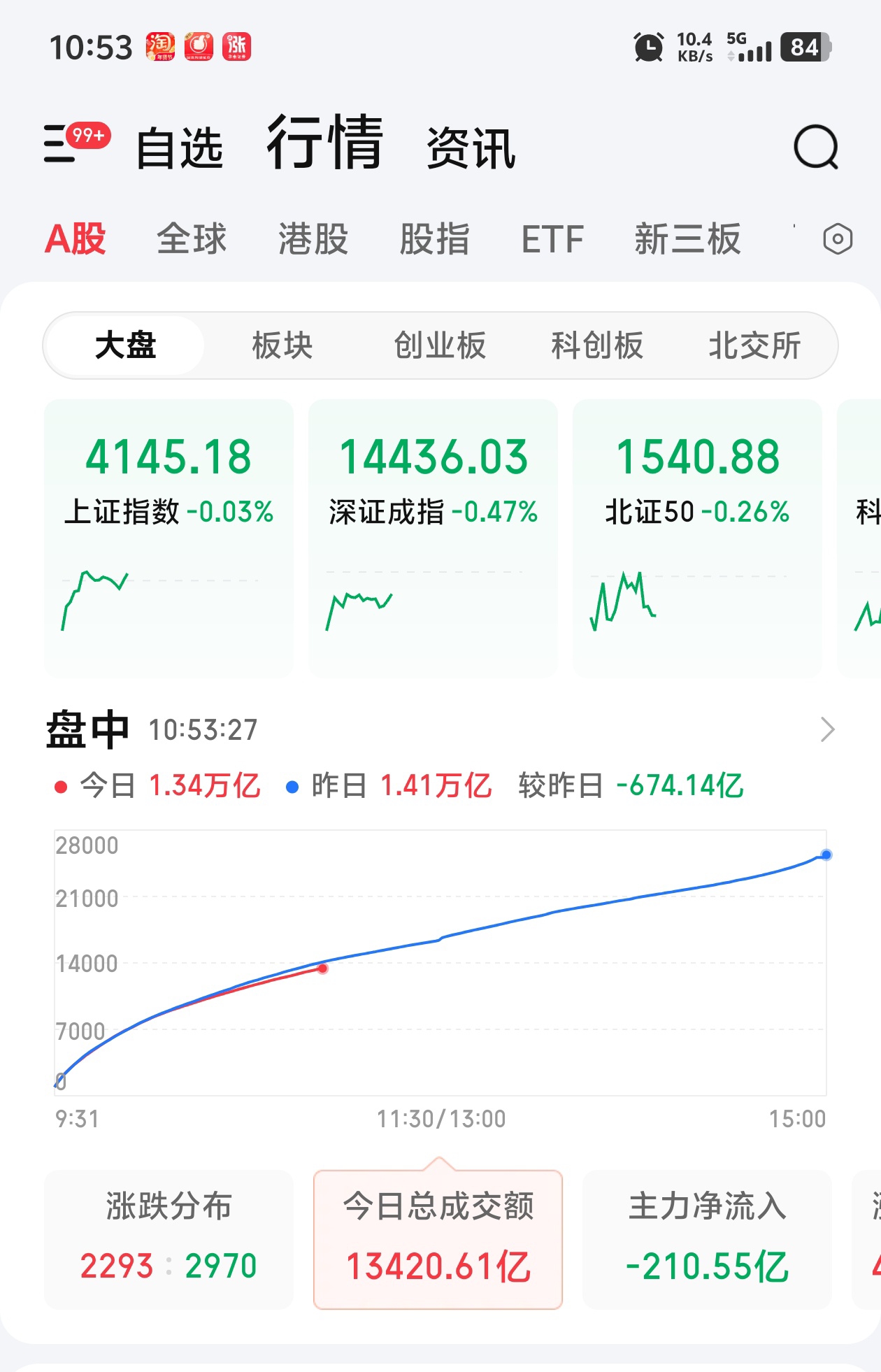 11点,上午缩量接近700亿,盘面结束放量趋势,恐慌情绪释放的差不多了,大盘股的