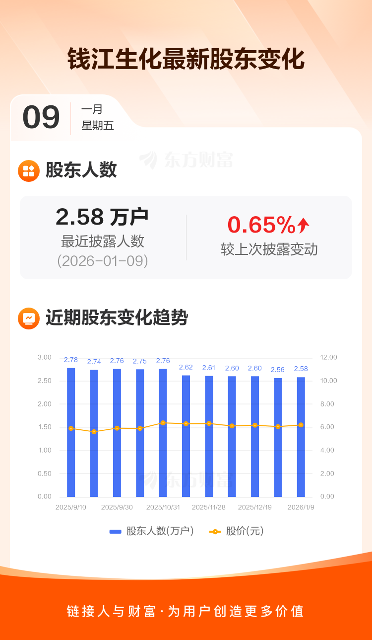 钱江生化:截至1月9日最新股东户数2.58万户,较上期增加0.65%