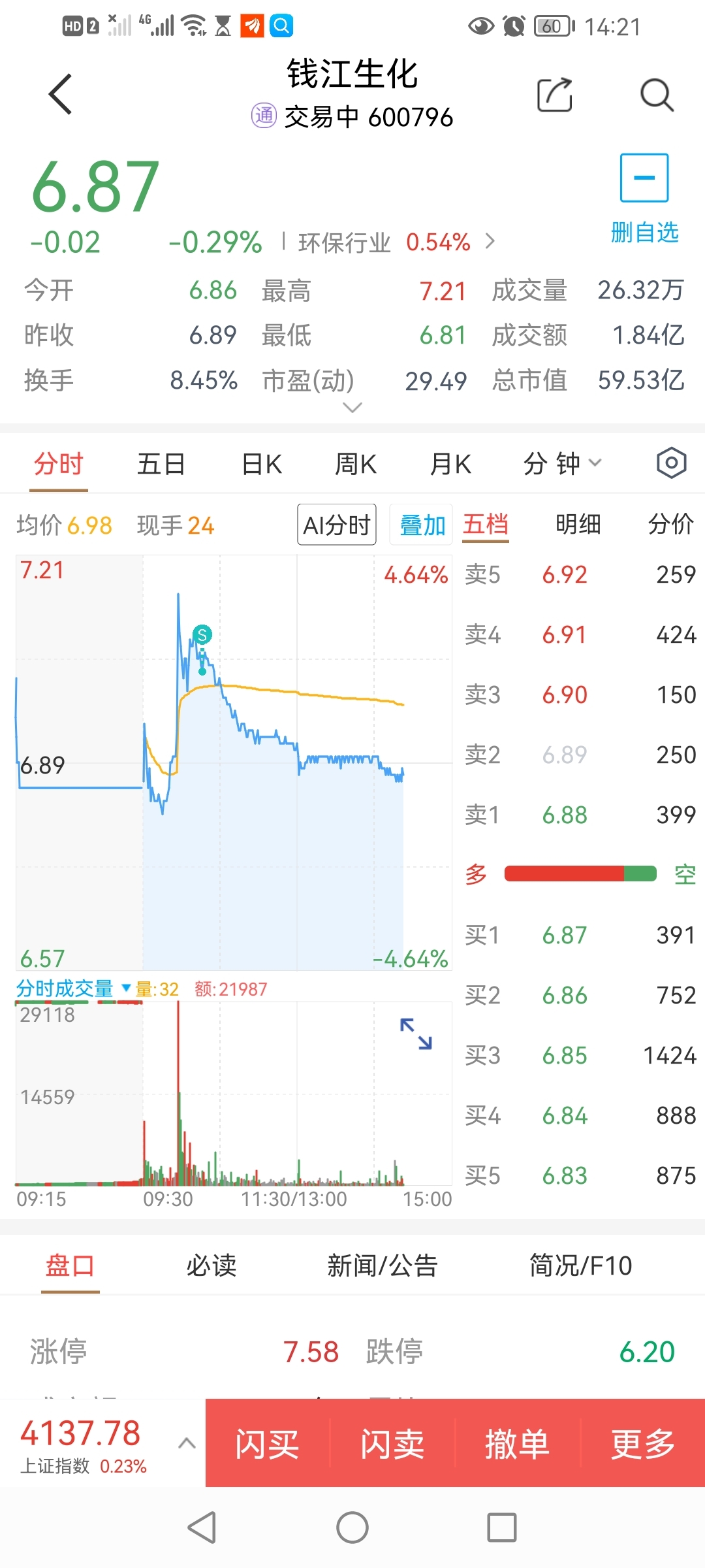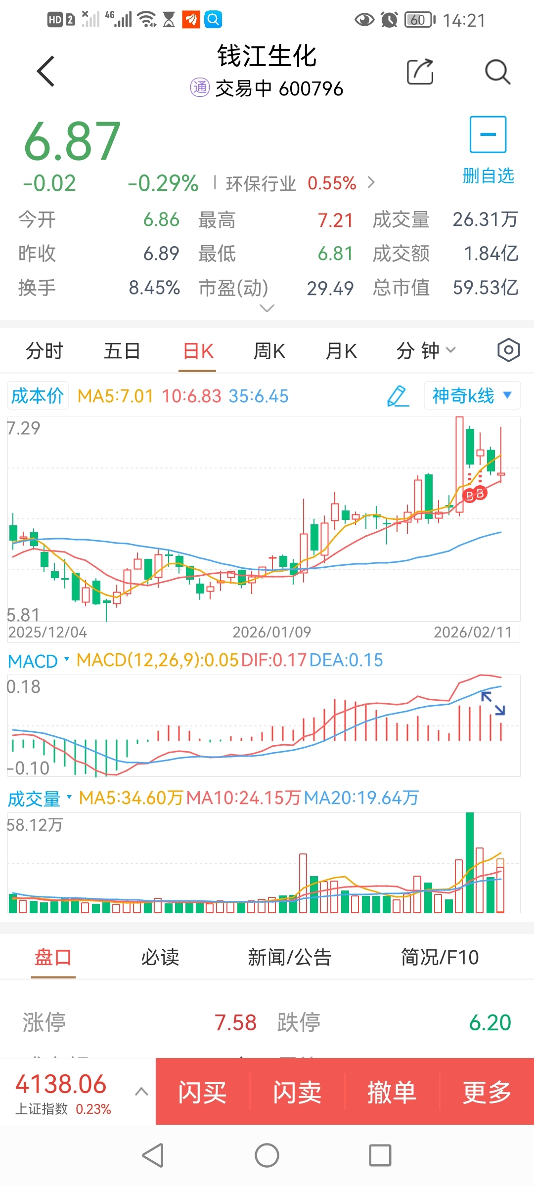 $钱江生化(SH600796)$ 不好意思,我卖了,等了2天,赚1%走了,事出反常必有妖