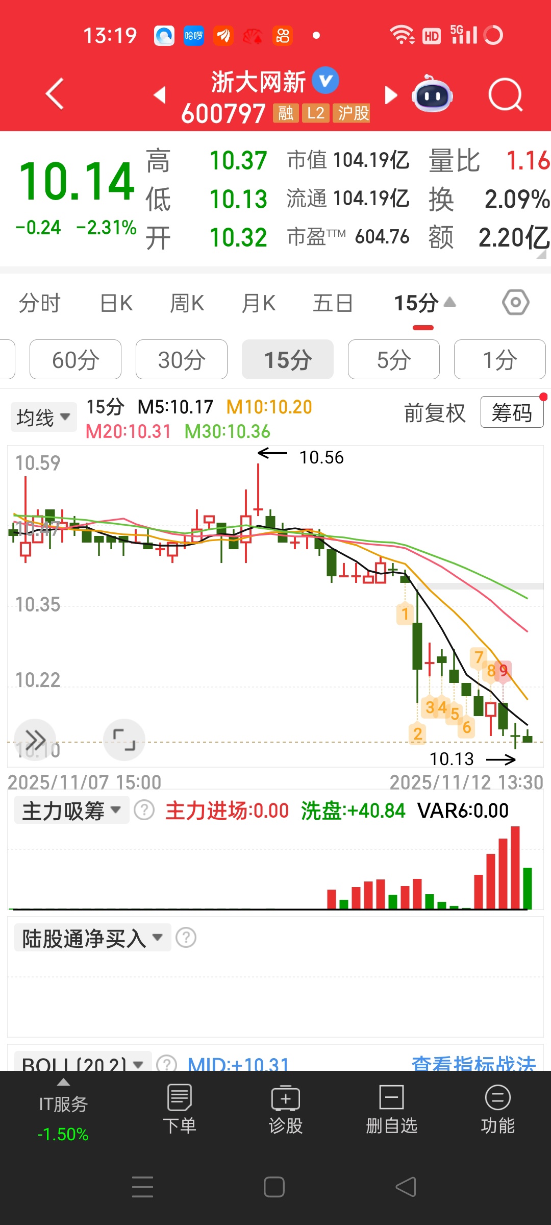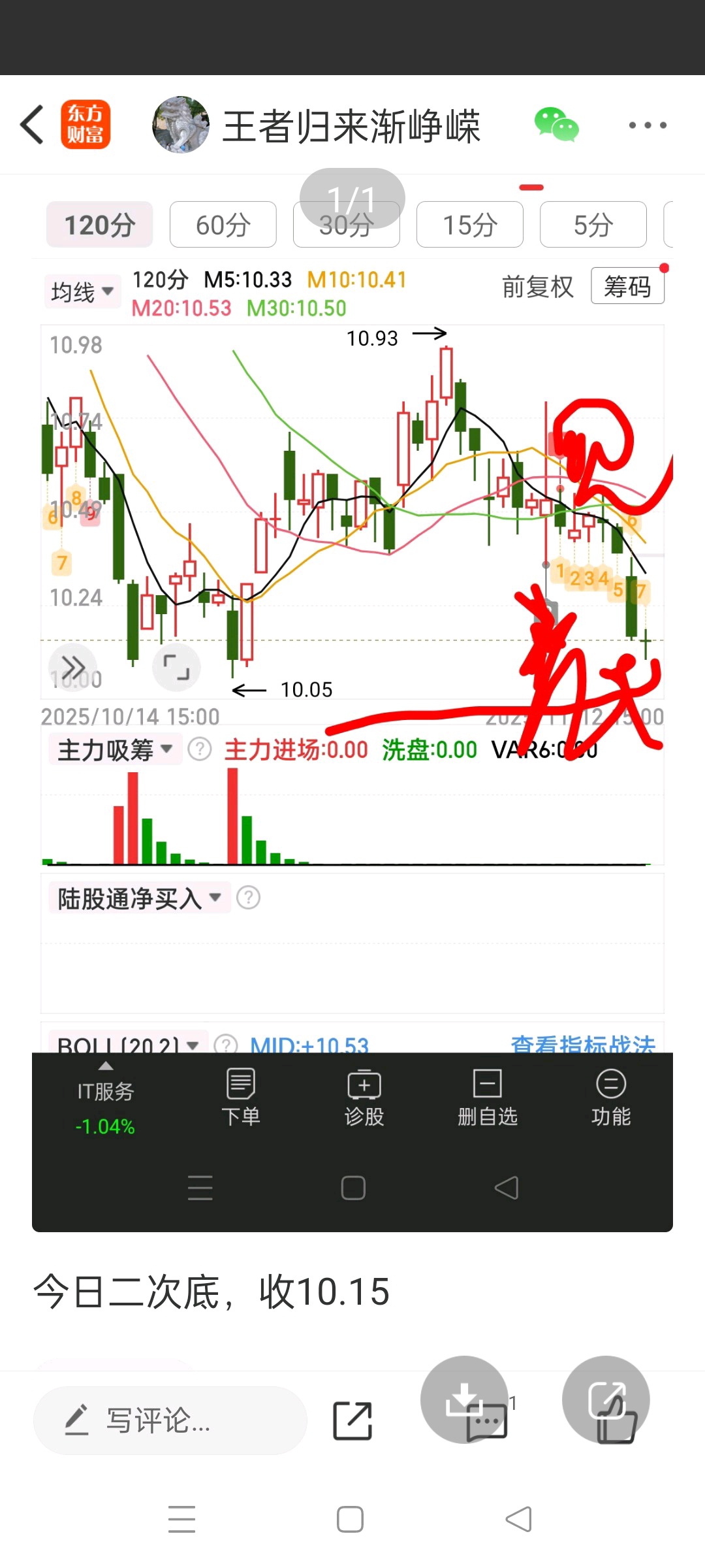 $浙大网新(SH600797)$ 从今日走势看,短期下跌尚未调整完成,但10.05底部,今天10.15都是可以建仓底部。周线看不会有大跌大涨,月线看收阴星线做完成下跌过程。12月线会有小阳,年后有主升行情。控制仓位,跌不动,涨加仓。10.15--10.54之间观望。