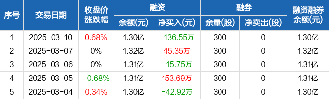 宁波海运:融资净偿还136.55万元,融资余额1.3亿元(03-10)