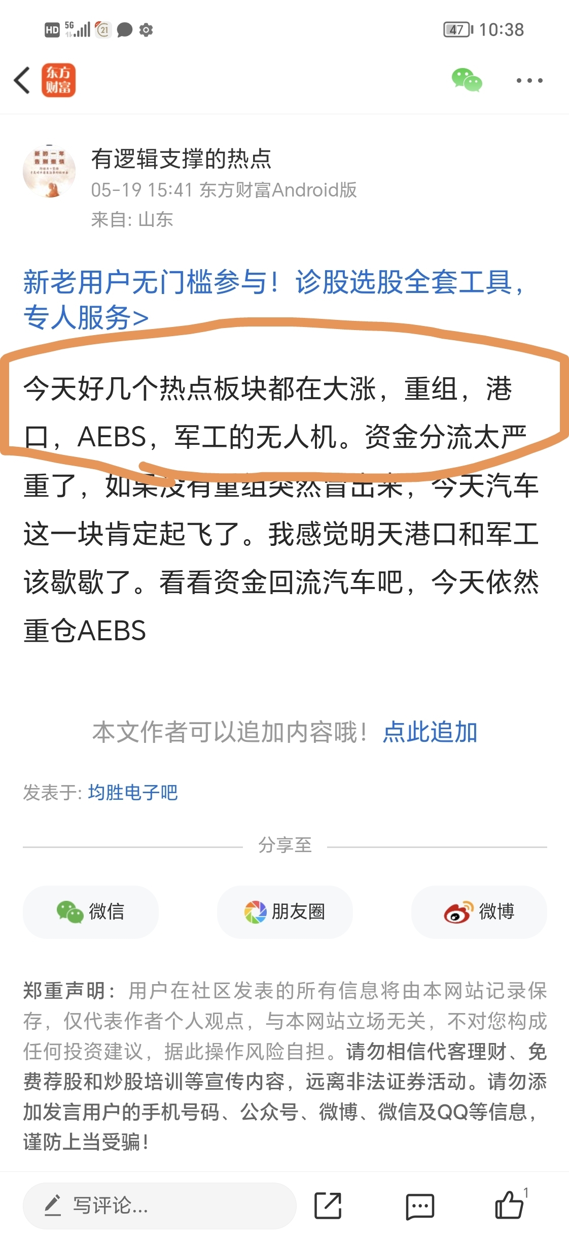 温馨提示: 1.根据《证券法》规定,禁止编造、传播虚假信息或者误导性信息,扰乱证券市场;2.用户在本社区发表的所有资料、言论等仅代表个人观点,与本网站立场无关,不对您构成任何投资建议。用户应基于自己的独立判断,自行决定证券投资并承担相应风险。《东方财富社区管理规定》