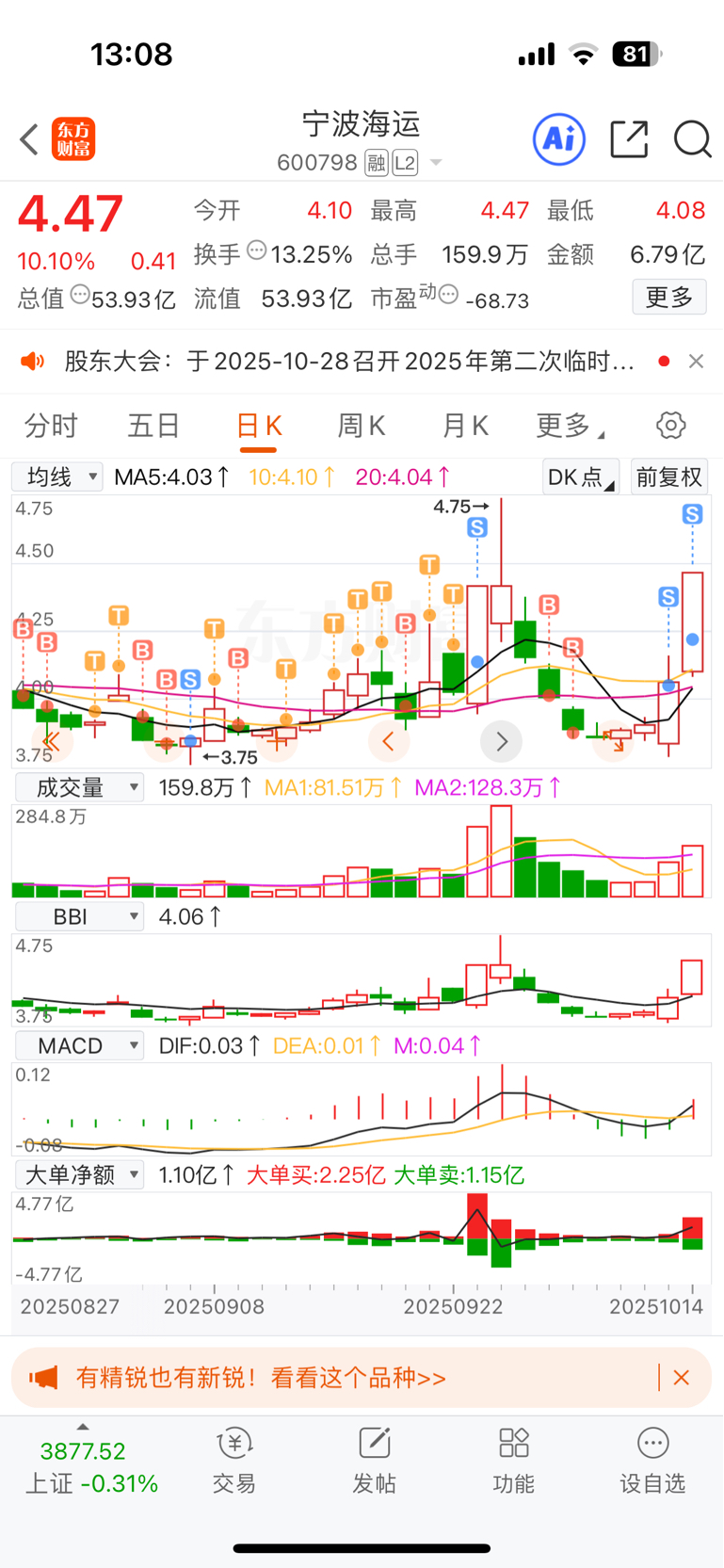 $宁波海运(SH600798)$ 两波板都没吃到。