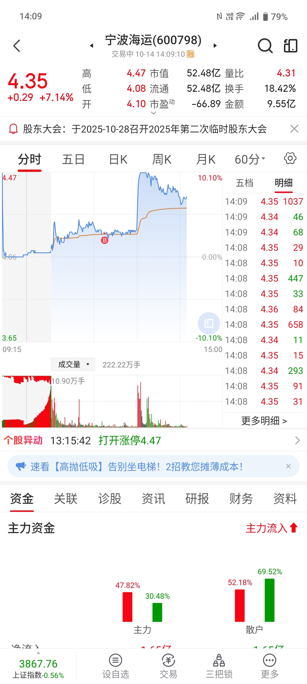 $宁波海运(SH600798)$ 明天大概率是低开了