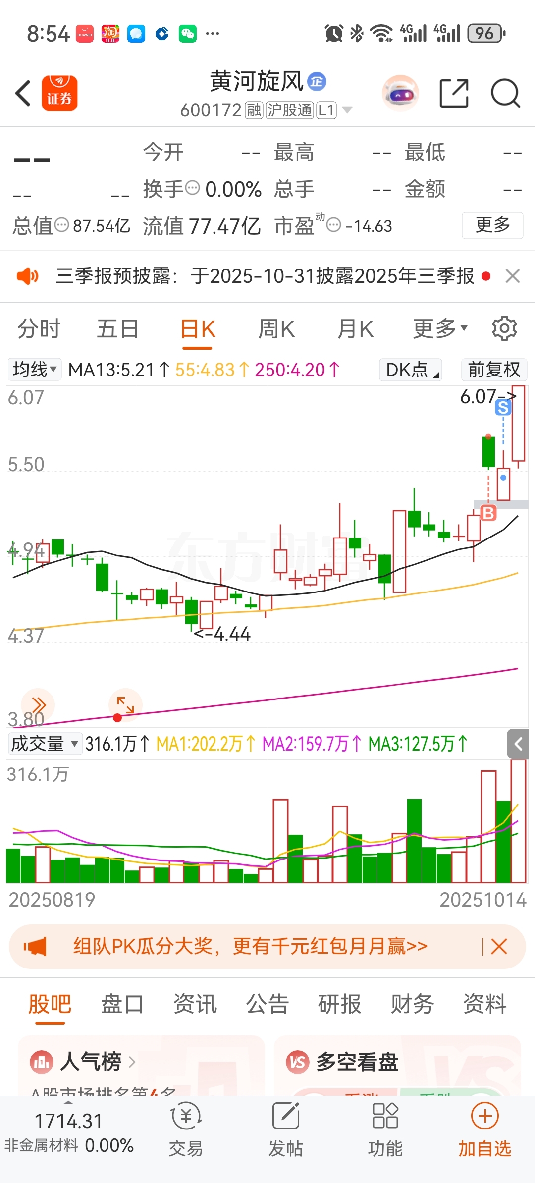 打板买的黄河旋风炸了,次日低开上拉,但是还是亏几个点卖了,昨日金刚石发酵了涨停,人气十几名,炸板的票,不要着急亏钱卖,今天如果不发酵,明天发酵一样冲高赚钱。这个票在板块排名第二,不是太差。