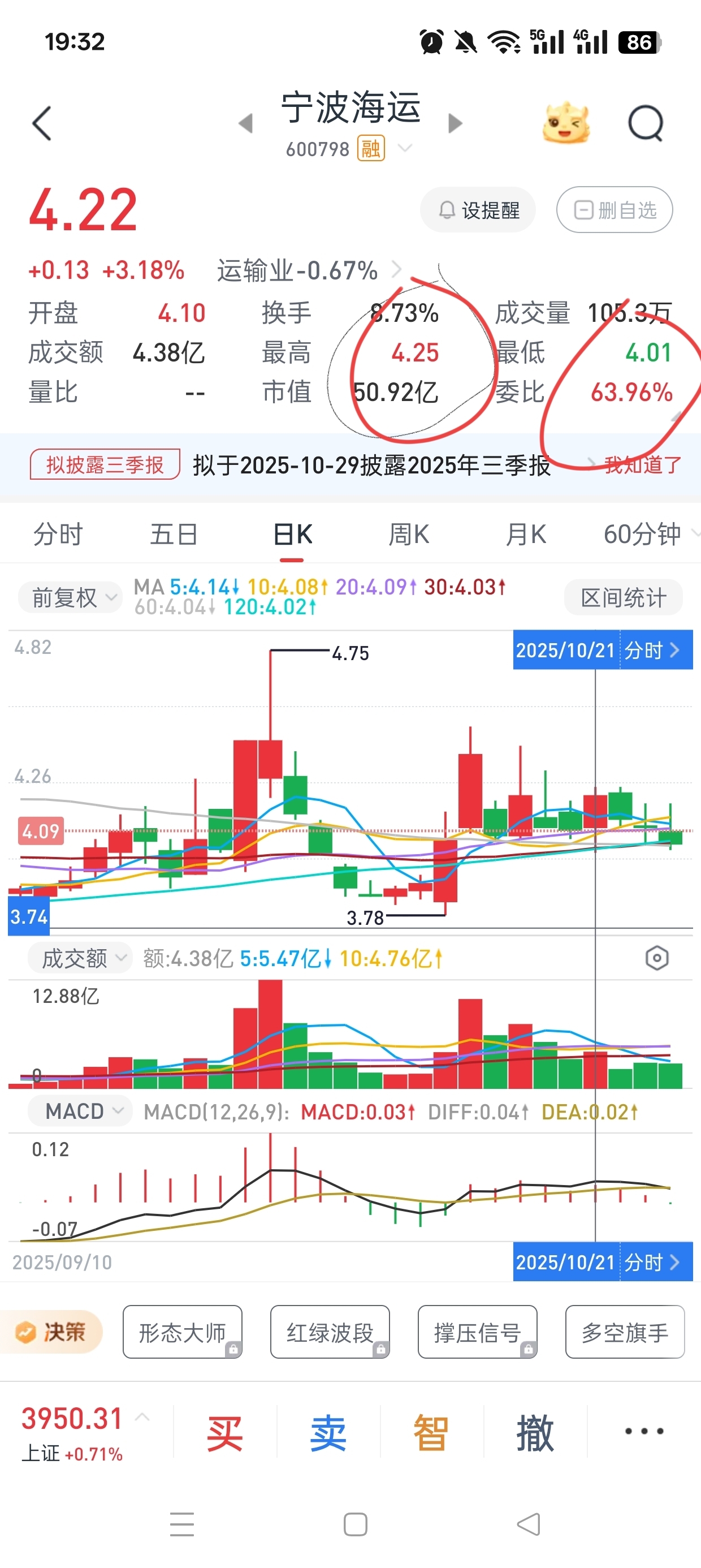 $宁波海运(SH600798)$ 宁波海运,周二的最高点跟最低点,周三,周四,周五一直在这个区间走,高点也没有过周二的,低一点也没有破周二的,到底是出货还是洗盘?这几天大盘这么好,被他磨死了