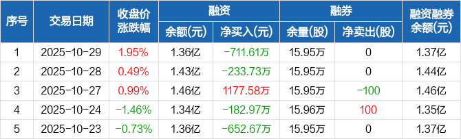宁波海运:融资净偿还711.61万元,融资余额1.36亿元(10-29)