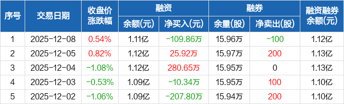 宁波海运:融资净偿还109.86万元,融资余额1.11亿元(12-08)