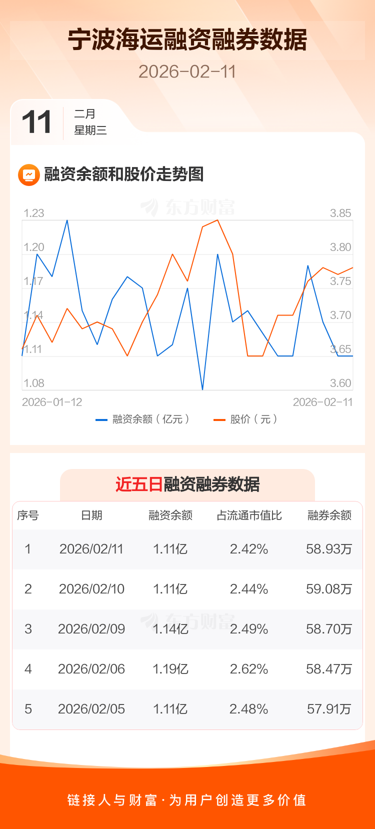 交易所最新数据显示,宁波海运于2026年2月11日获融资买入406.40万元,融资偿还429.87万元,当日融资净偿还23.47万元。目前,该股融资余额1.11亿,占流通市值比例为2.42%。