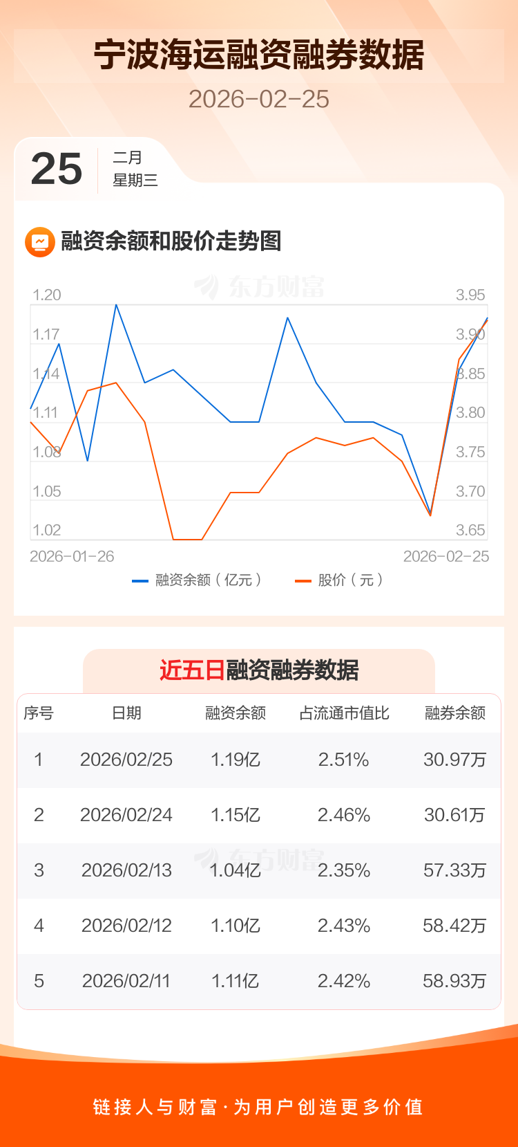 交易所最新数据显示,宁波海运于2026年2月25日获融资买入3526.07万元,融资偿还3154.45万元,当日融资净买入371.63万元。目前,该股融资余额1.19亿,占流通市值比例为2.51%。