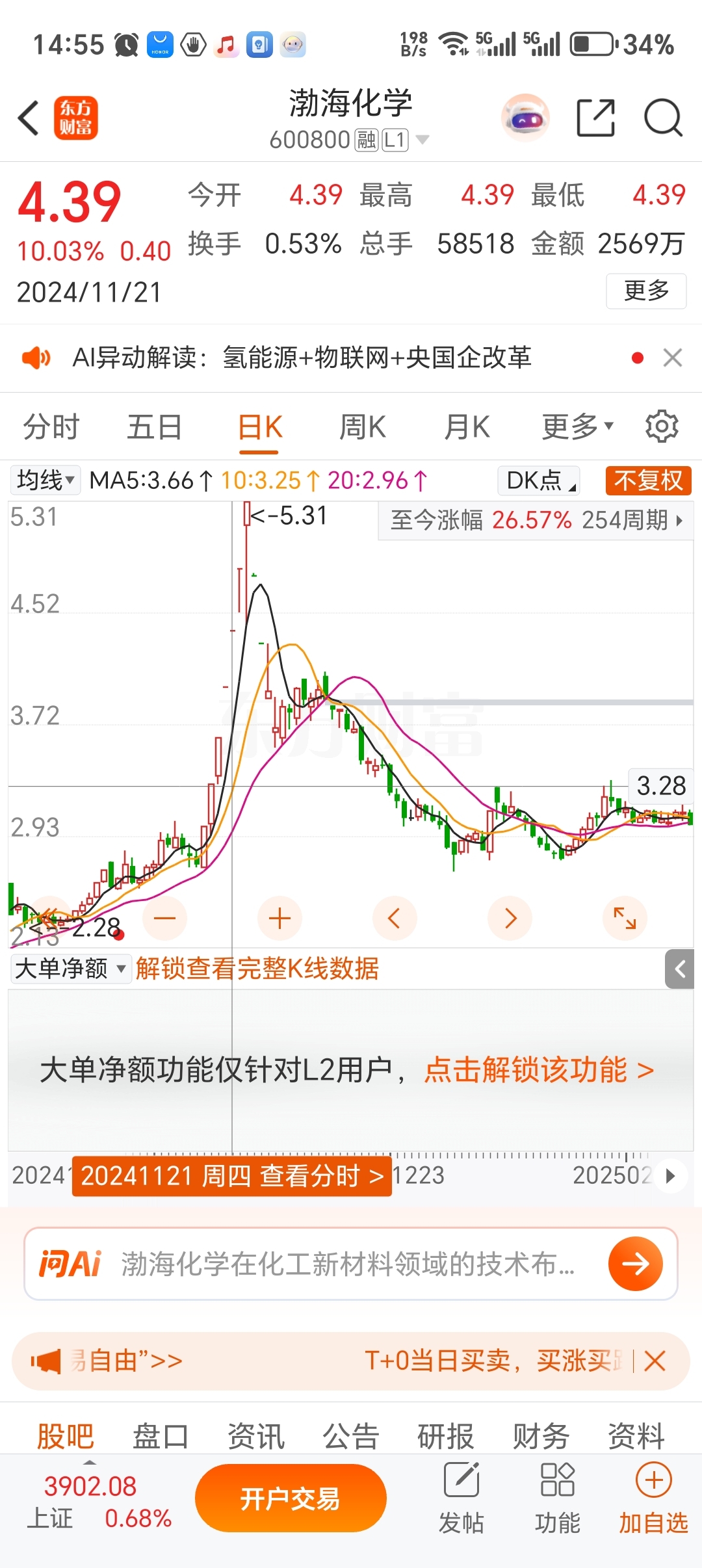 $渤海化学(SH600800)$ 最少7板