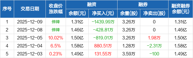 融资方面,当日融资买入0元,融资偿还1439.99万元,融资净偿还1439.99万元,连续3日净偿还累计2687.8万元。融券方面,融券卖出0股,融券偿还0股,融券余量3.26万股,融券余额16.46万元。融资融券余额合计1.31亿元。