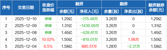 融资方面,当日融资买入0元,融资偿还215.48万元,融资净偿还215.48万元,连续4日净偿还累计2903.28万元。融券方面,融券卖出0股,融券偿还0股,融券余量3.26万股,融券余额16.46万元。融资融券余额合计1.29亿元。