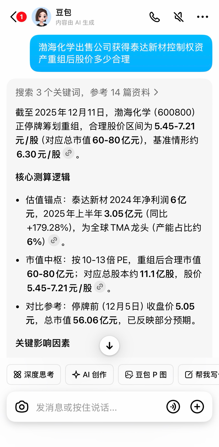 $渤海化学(SH600800)$ 豆包说不会超过7块
