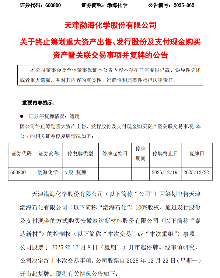 停牌两周后,12月19日晚间,渤海化学(600800)披露公告称,公司终止筹划重大资产出售、发行股份及支付现金购买资产暨关联交易事项,公司股票自12月22日起复牌。