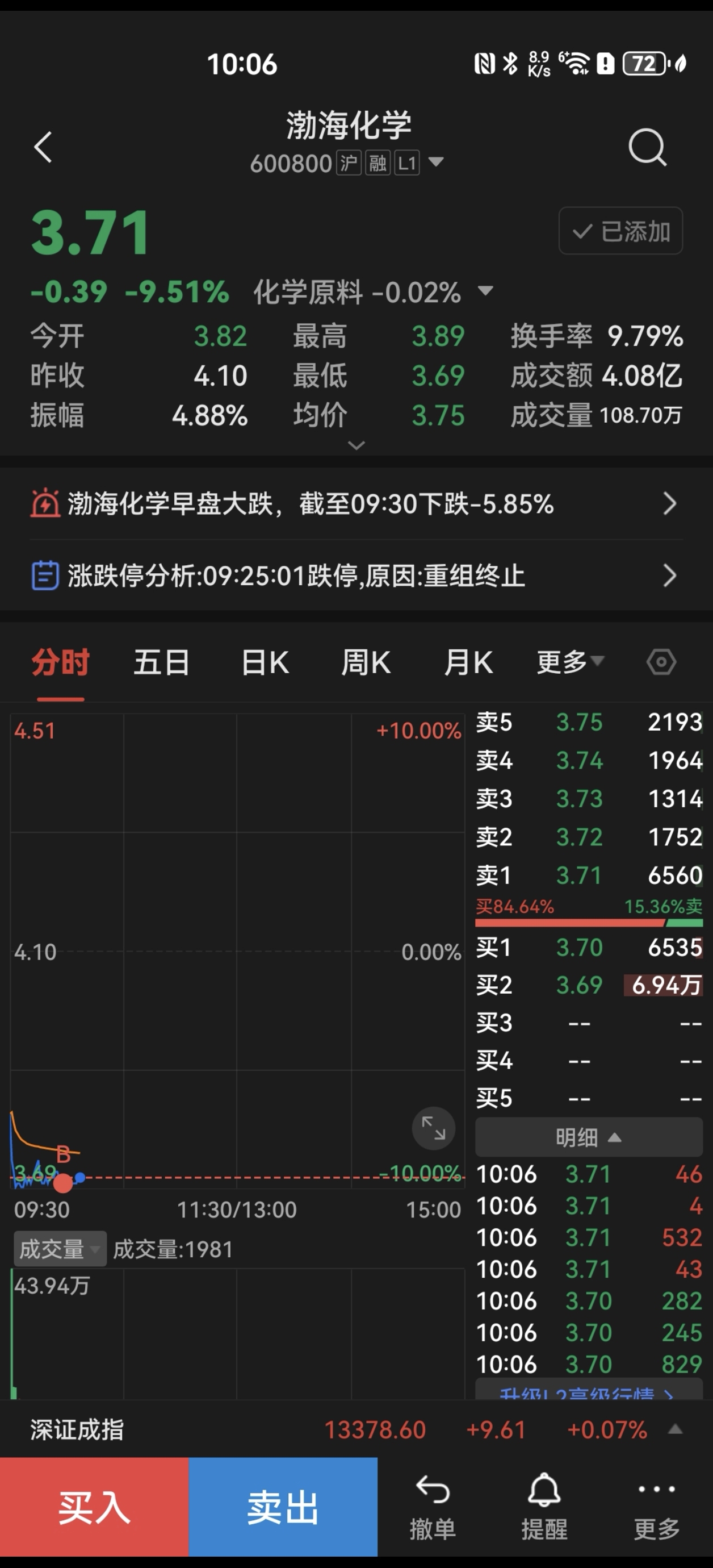 $渤海化学(SH600800)$ 3.7元买点,跌停才亏一分钟,少跌赚几个点,超跌反弹明天又赚几点,今明两天比大多数股都保险!值得一博。